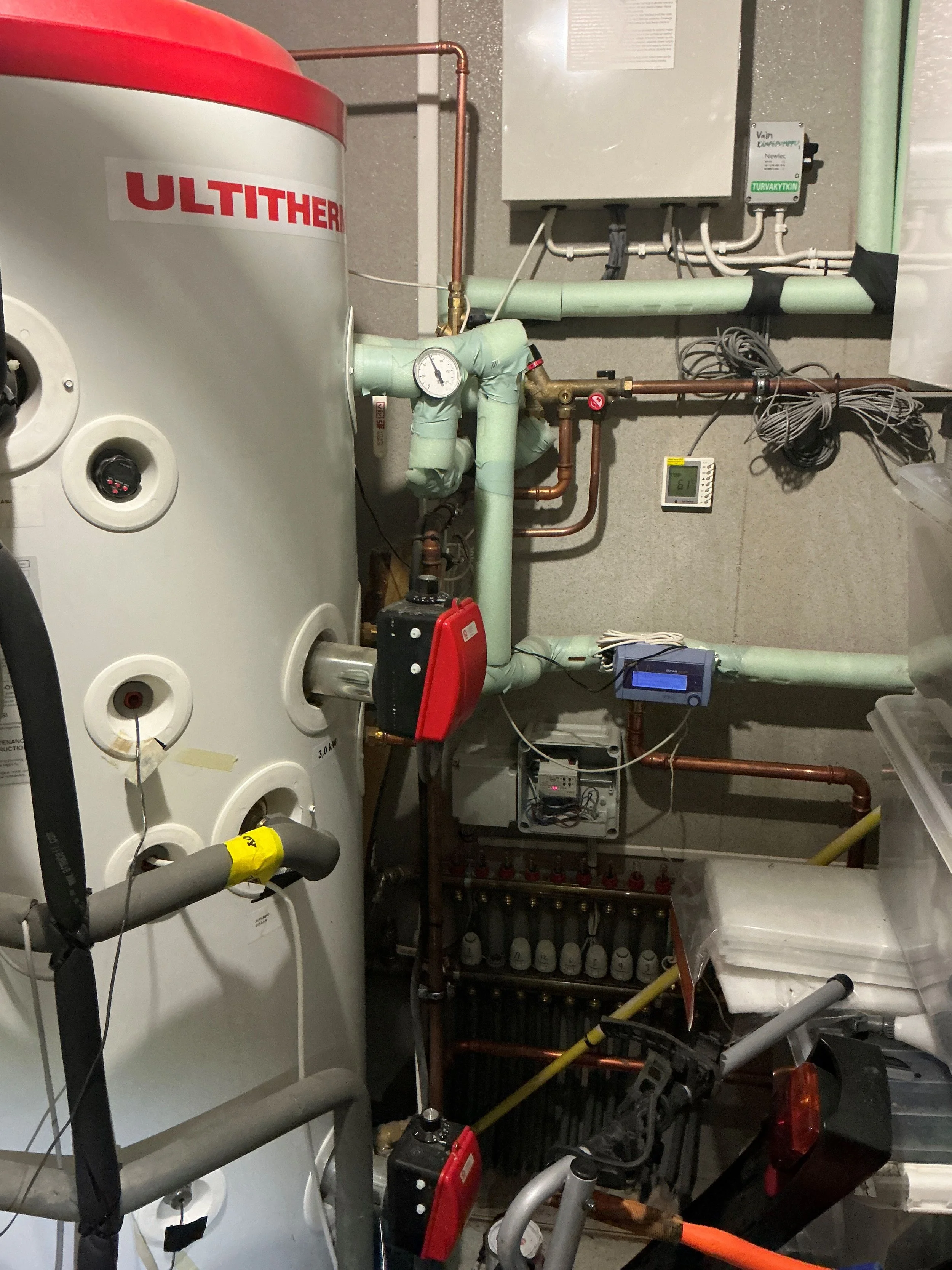 Järjestelmän rinnalle oli asennettu iso käyttövesivaraaja sekä aurinkokeräimet, joiden oli tarkoitus tukea energiatehokasta arkea.