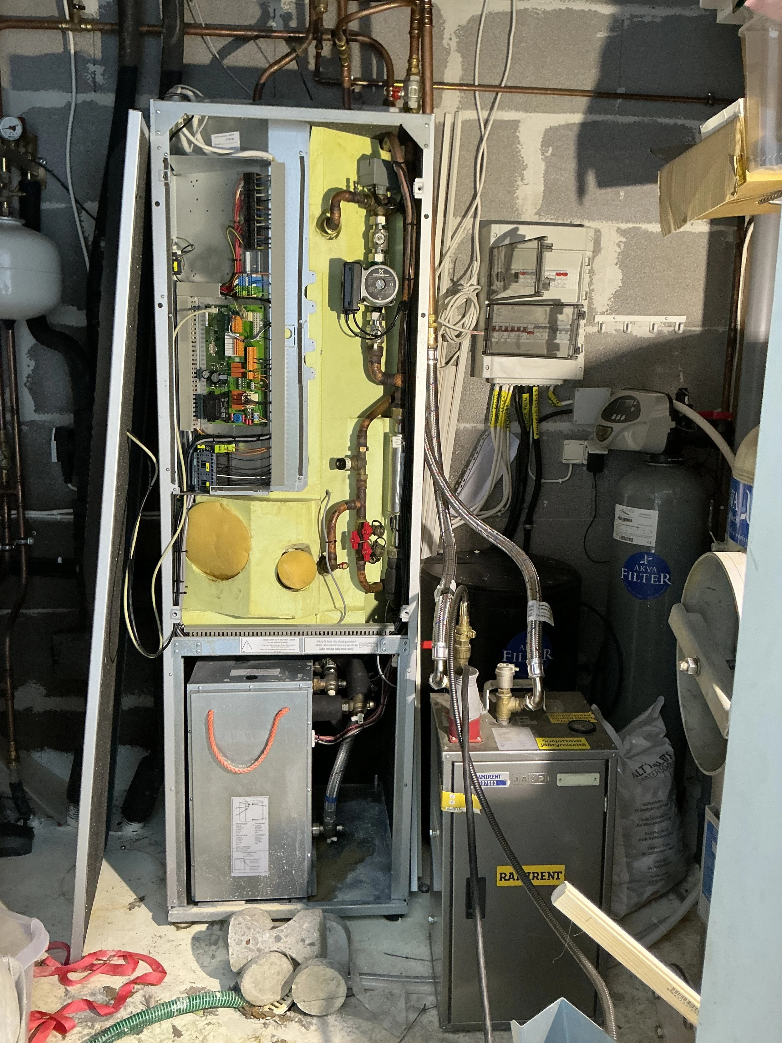 Väliaikaiseksi ratkaisuksi asiakas vuokrasi viikonlopuksi Jäspin Apuwatti -sähkökattilan, joka huolehti lämmityksestä siihen saakka, kunnes uusi maalämpöpumppu saatiin paikalleen.